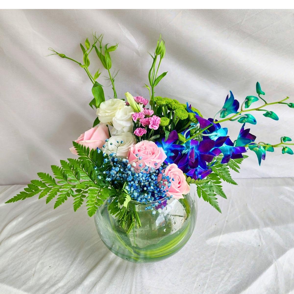 Soft roses paired with delicate orchids, artfully arranged in a clear fish bowl—perfect for adding understated luxury to any space.