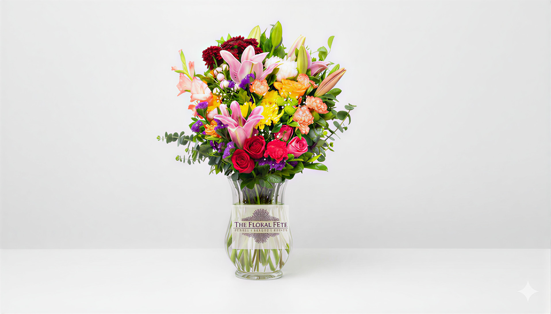 A vibrant celebration of colour and texture, this arrangement brings together lush lilies, classic roses, cheerful chrysanthemums, and delicate filler blooms in a joyful, garden-inspired composition. Arranged in a clear glass vase, it feels abundant yet refined—perfectly capturing the charm of a blooming garden and the beauty of flowers coming together in harmonious contrast.