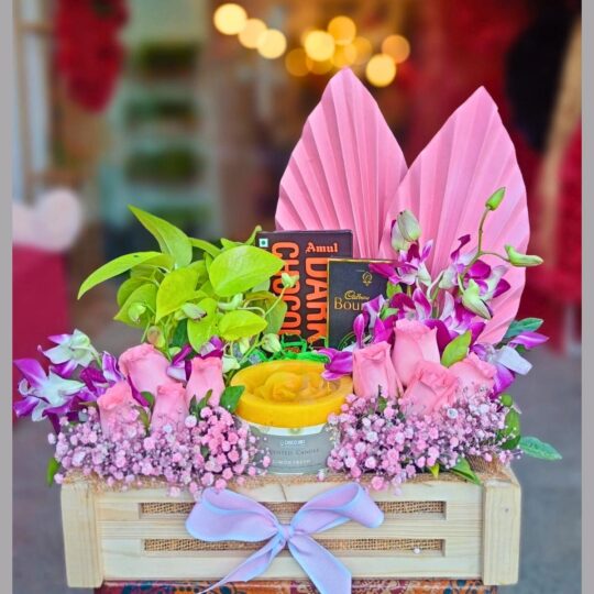 A charming curation that blends freshness and indulgence — featuring pink roses, orchids, fillers, a lush green plant, chocolates, and a scented candle, all beautifully arranged in a wooden crate with pastel accents. Perfect for birthdays, anniversaries, or thoughtful surprises, this hamper is a delightful mix of elegance, fragrance, and sweetness. 12-14 stems of flowers