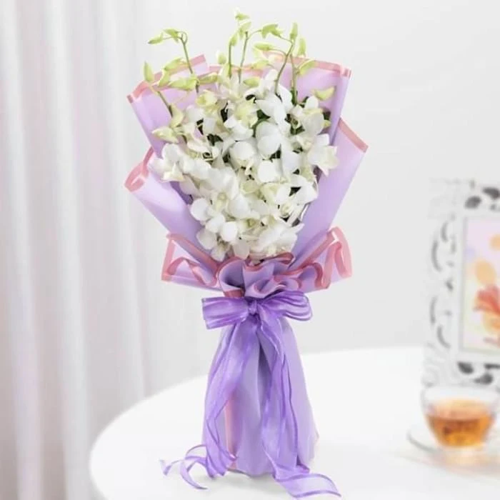 This elegant arrangement features pristine white orchids that evoke a sense of calm and timeless grace. Its minimalist beauty makes it a perfect symbol of purity and sophisticated luxury.