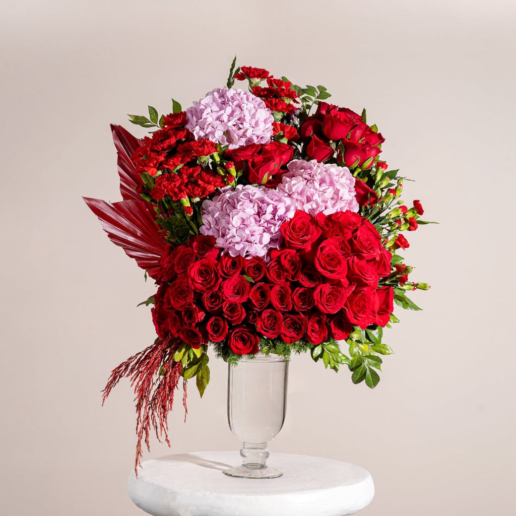 A bold composition of deep red roses, red carnations paired with soft lilac hydrangeas, this arrangement is rich, dramatic, and undeniably luxe. Designed in a sculptural form, it celebrates passion balanced with elegance—perfect for making a powerful statement.