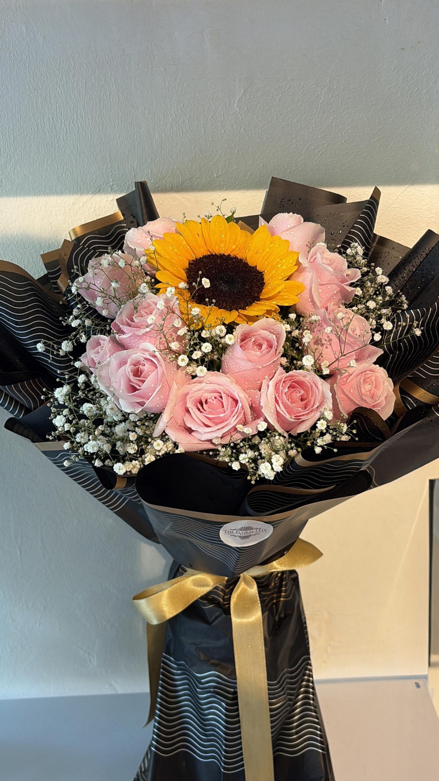 A cheerful sunflower nestled amongst pink roses, perfectly balancing joy and grace and tightly wrapped in black wrapping paper for a bold contrast.